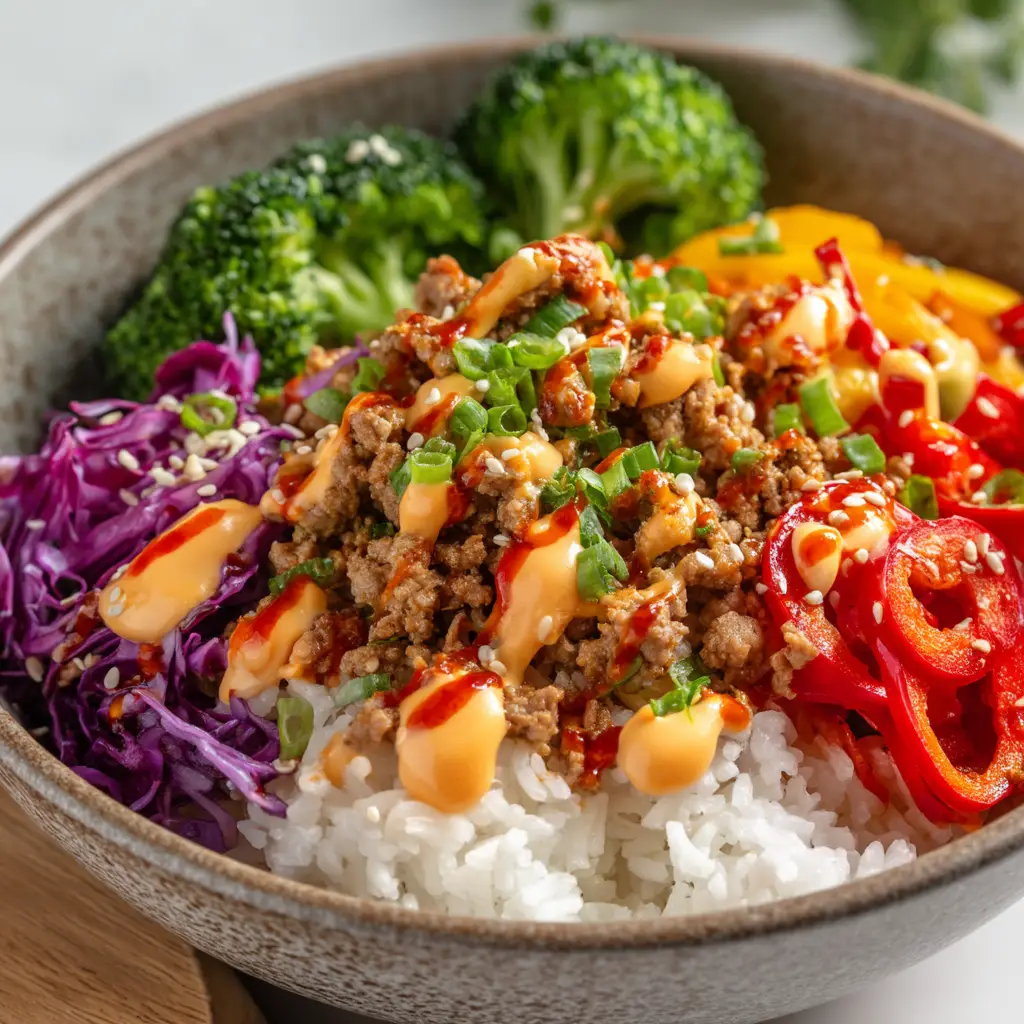 A vibrant bang bang ground turkey bowl topped with broccoli, red cabbage, peppers, and creamy light-orange bang bang sauce.